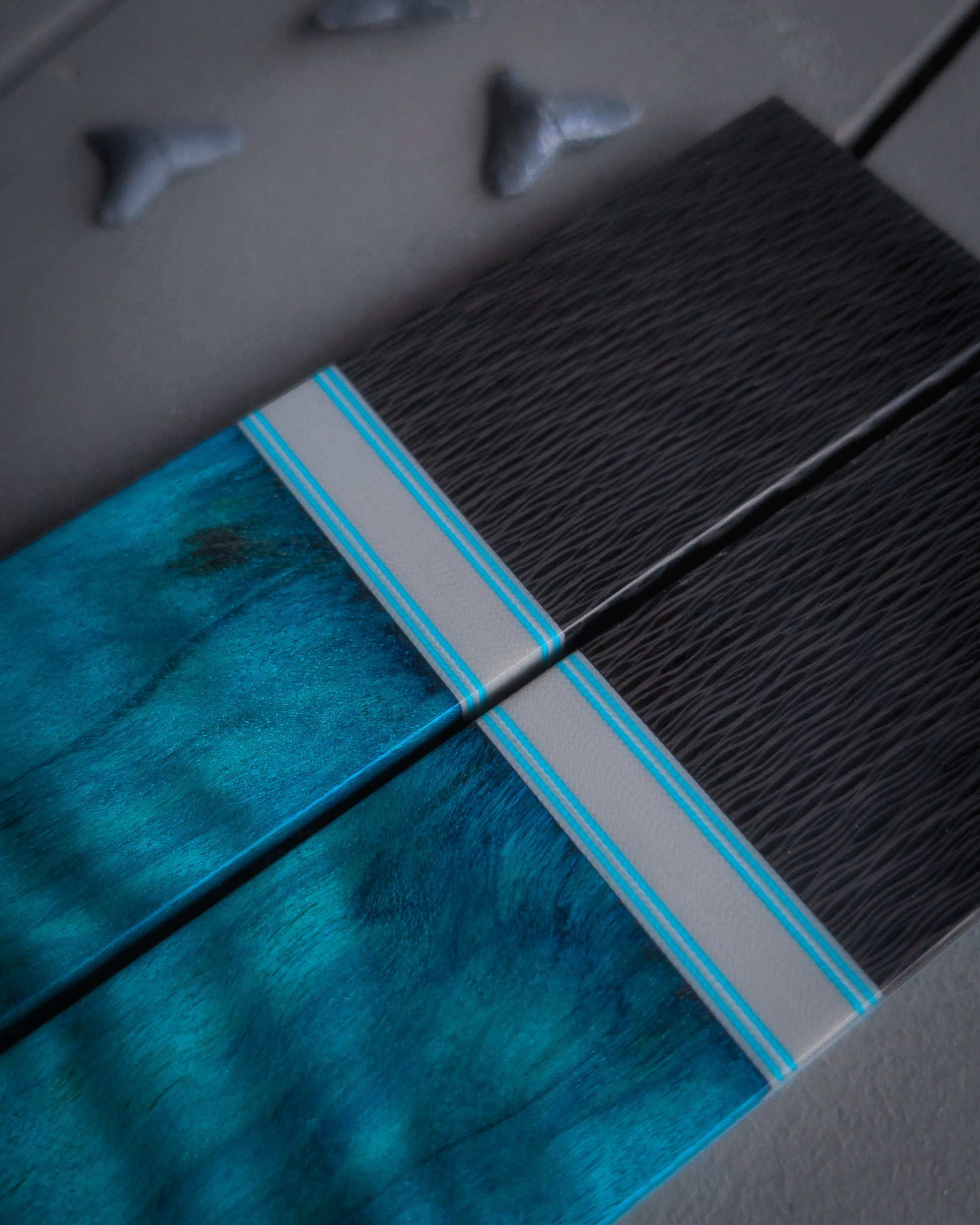 Material: Teal dyed curly maple. Crosscut carbon fiber. Grey G10 spacer with teal and white accents. Grey and teal liners.