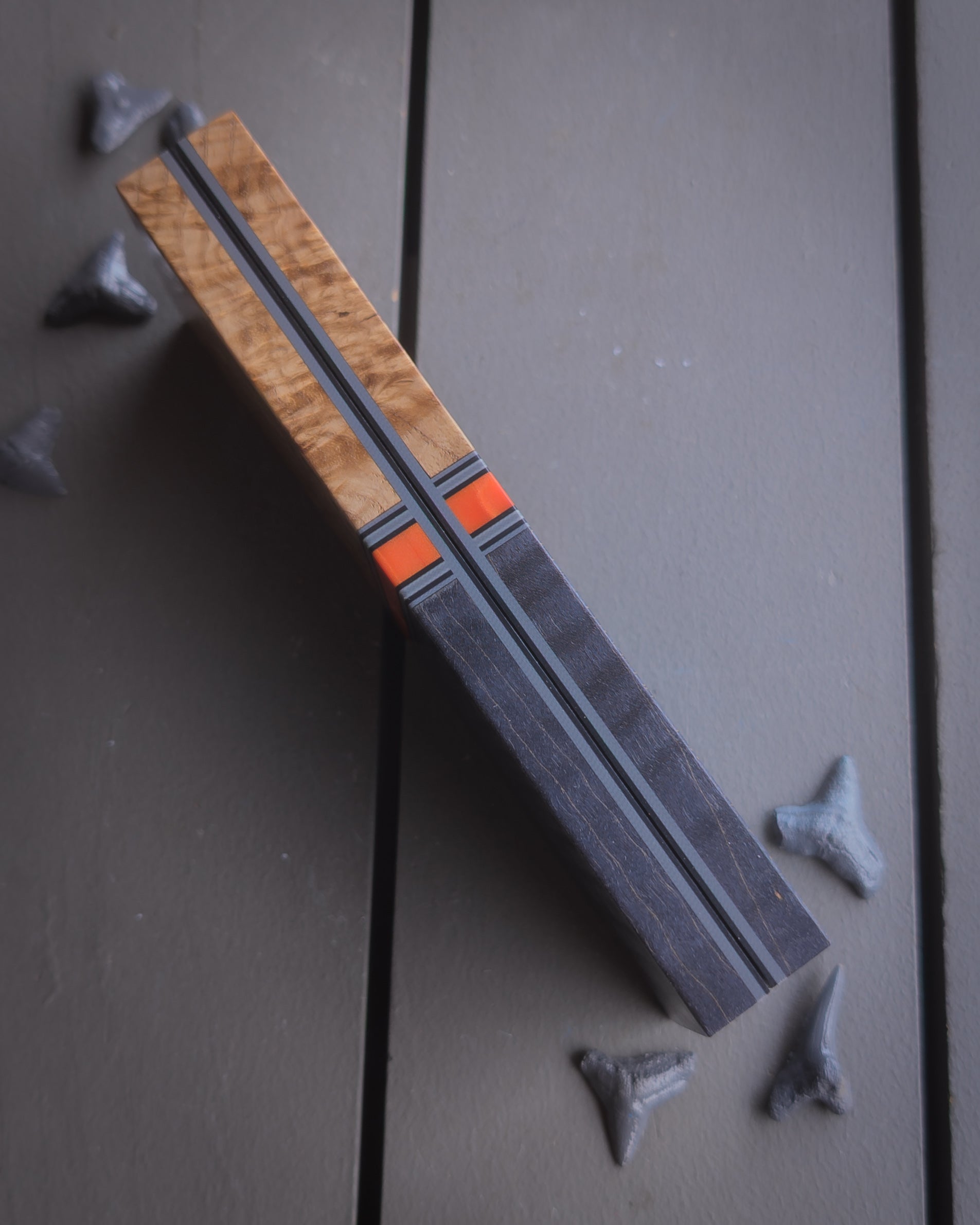 Material: Black ash burl. Black curly maple. Orange human spacer with grey and black accents. Grey and black liners.