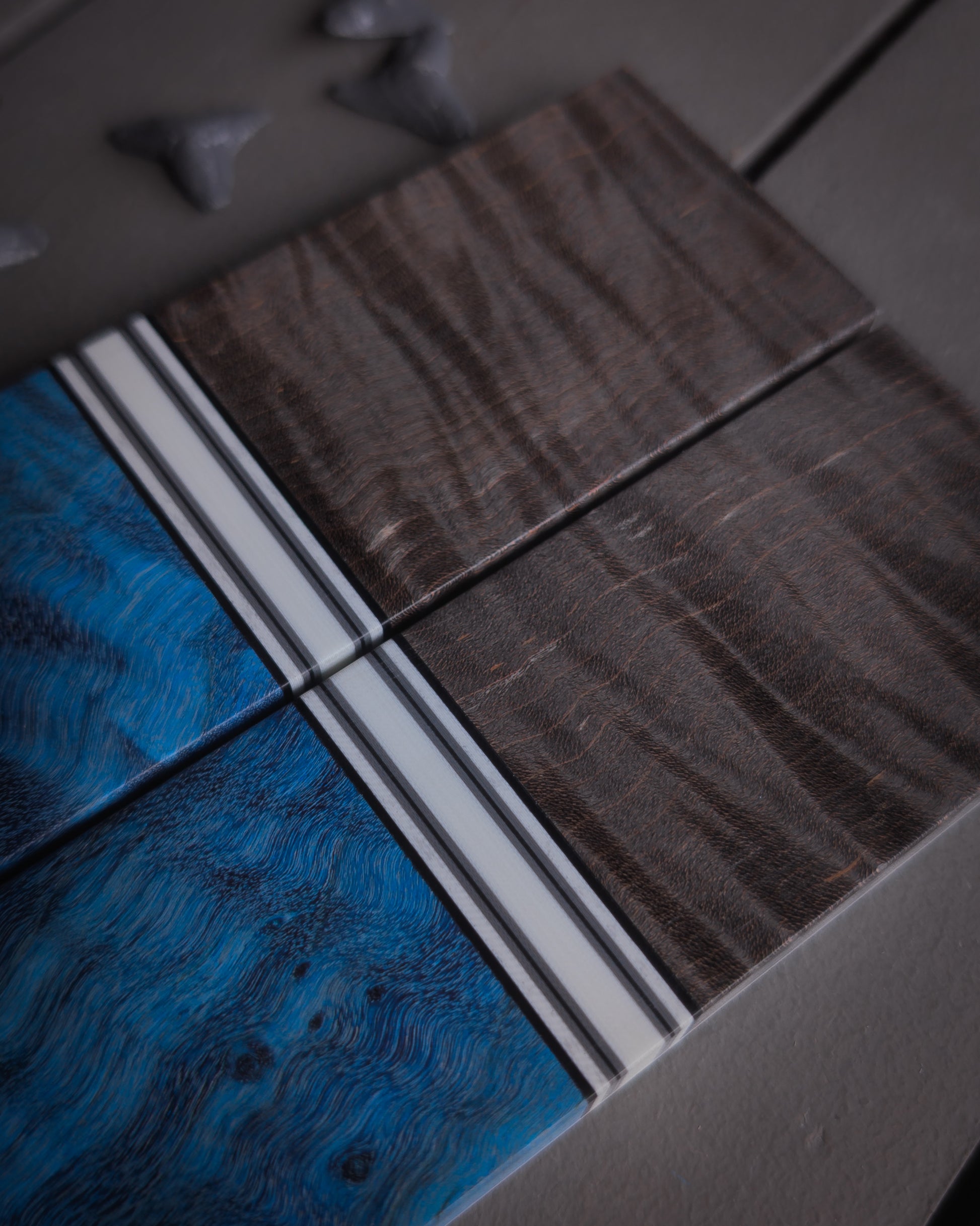 Material: Blue curly maple. Black curly maple. White G10 spacer with grey and black and white accents. White and black liners.