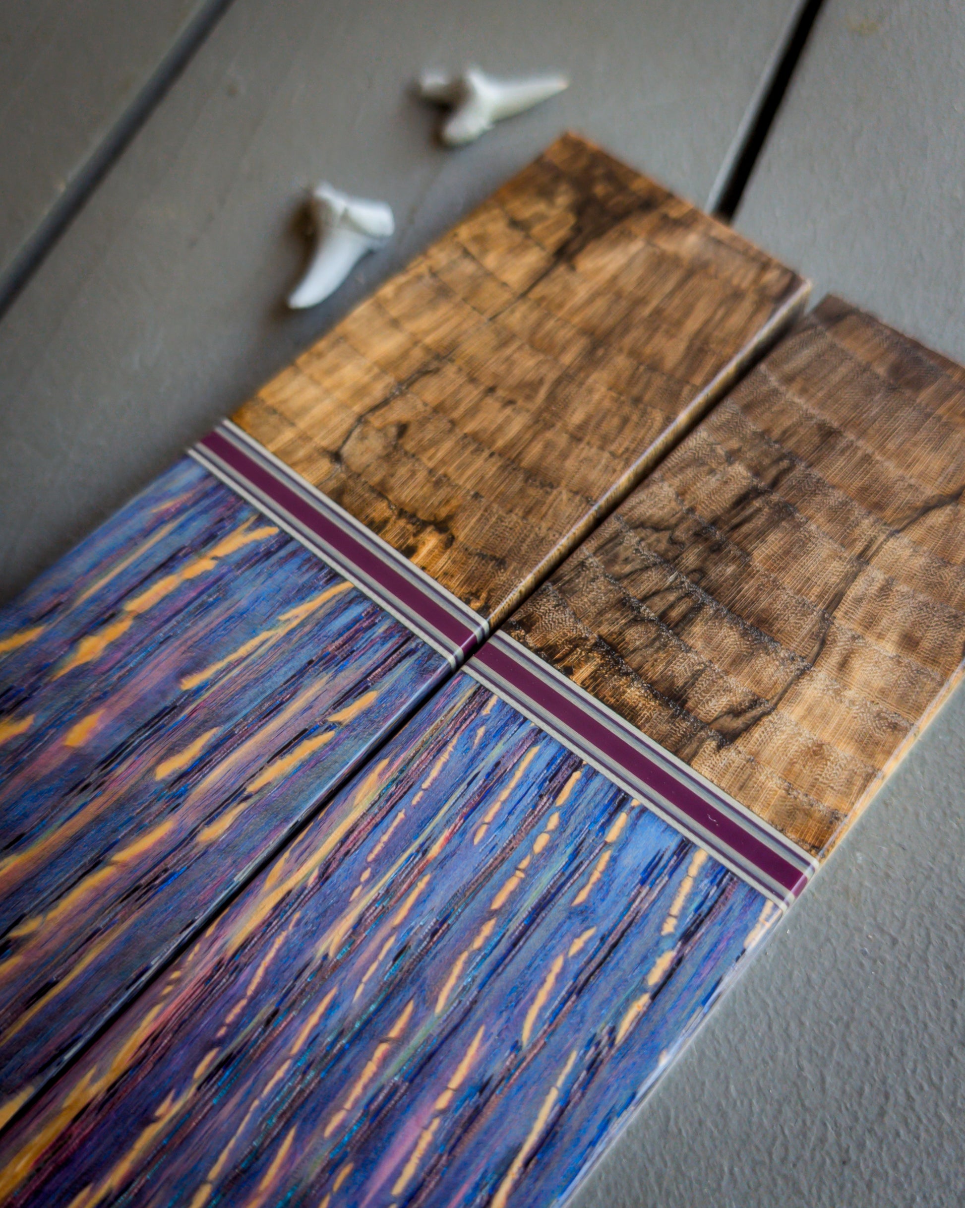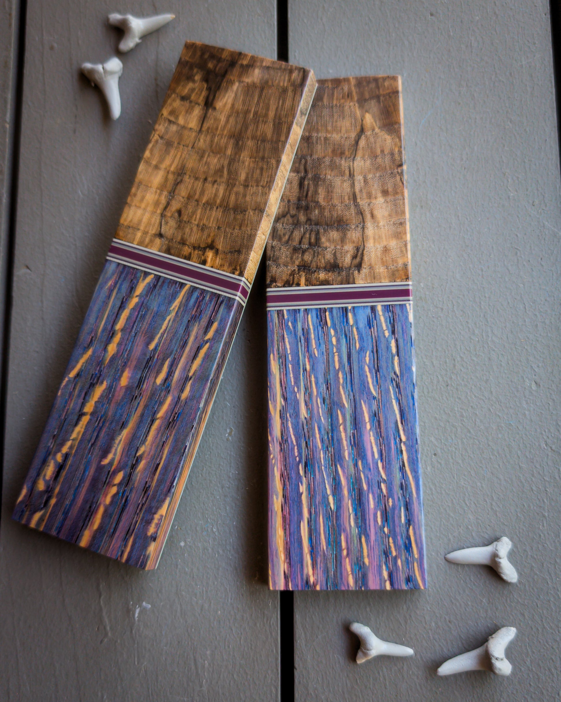 Material: Spalted maple. Purple dyed white oak. Purple acrylic spacer with grey and purple accents. Grey liners.
