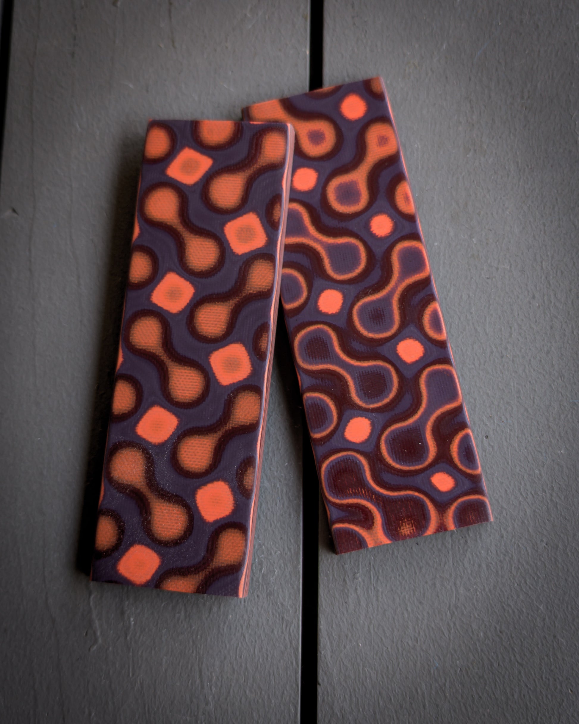 Material: Purple, orange, and maroon "lava" G10 from Current Composites.