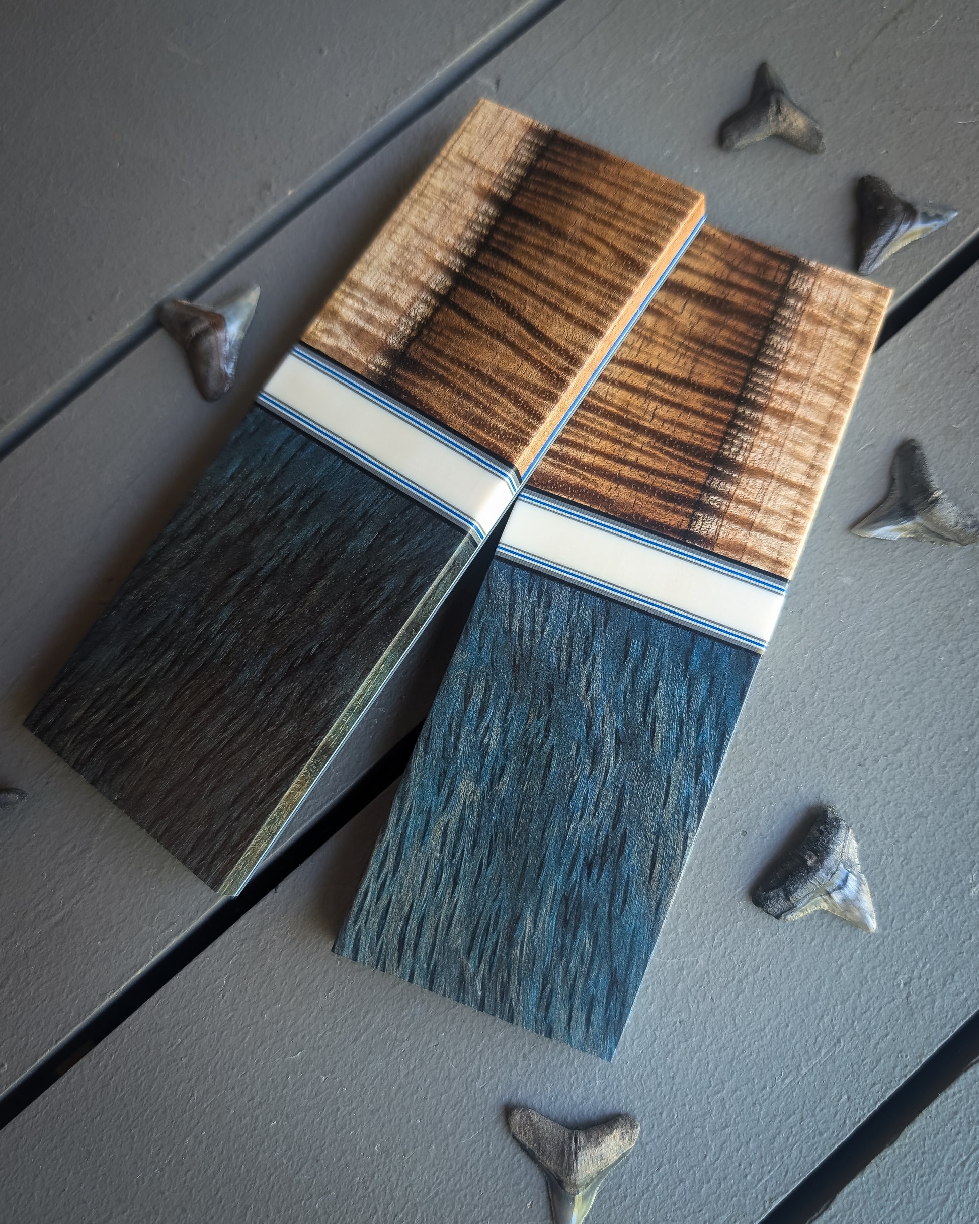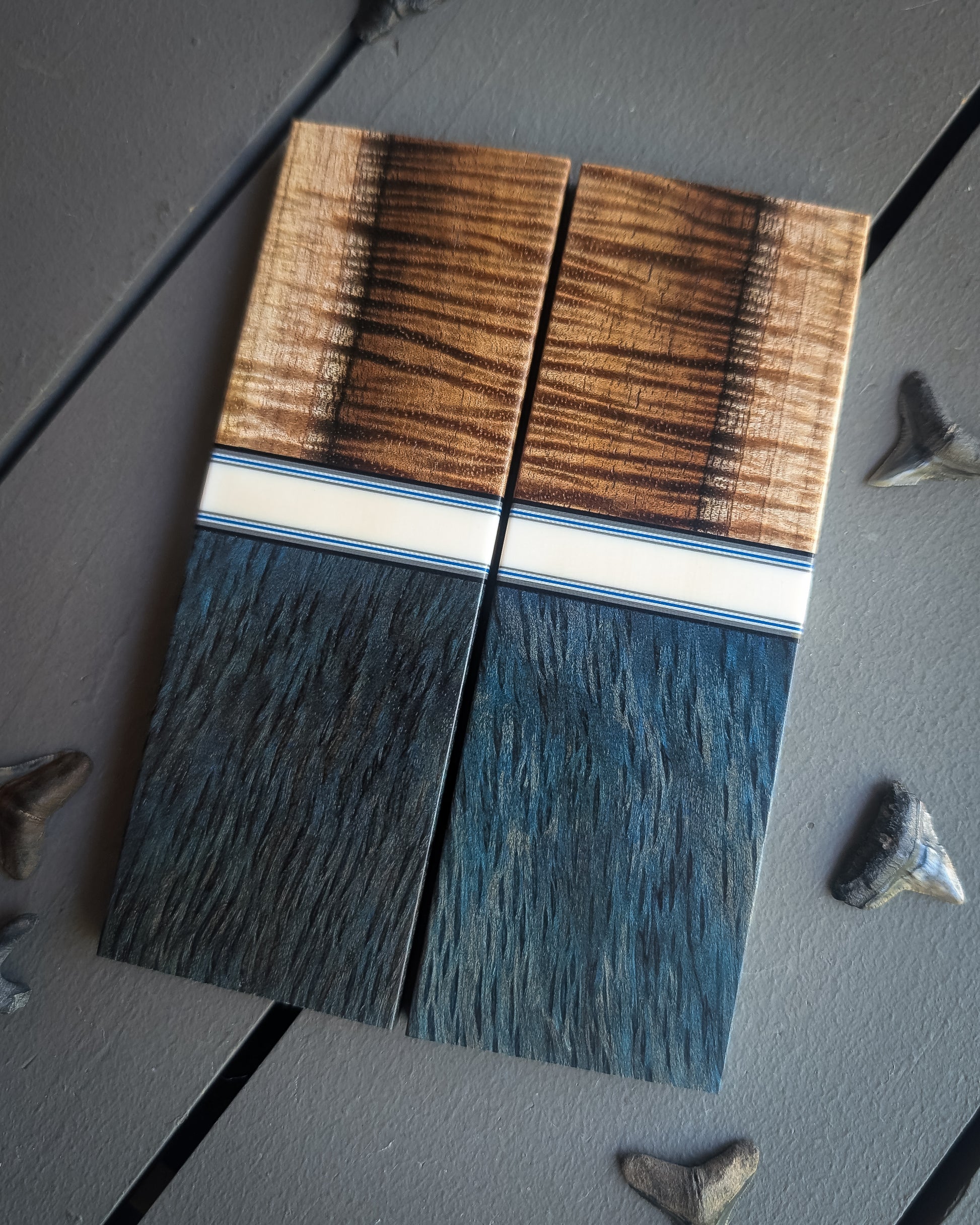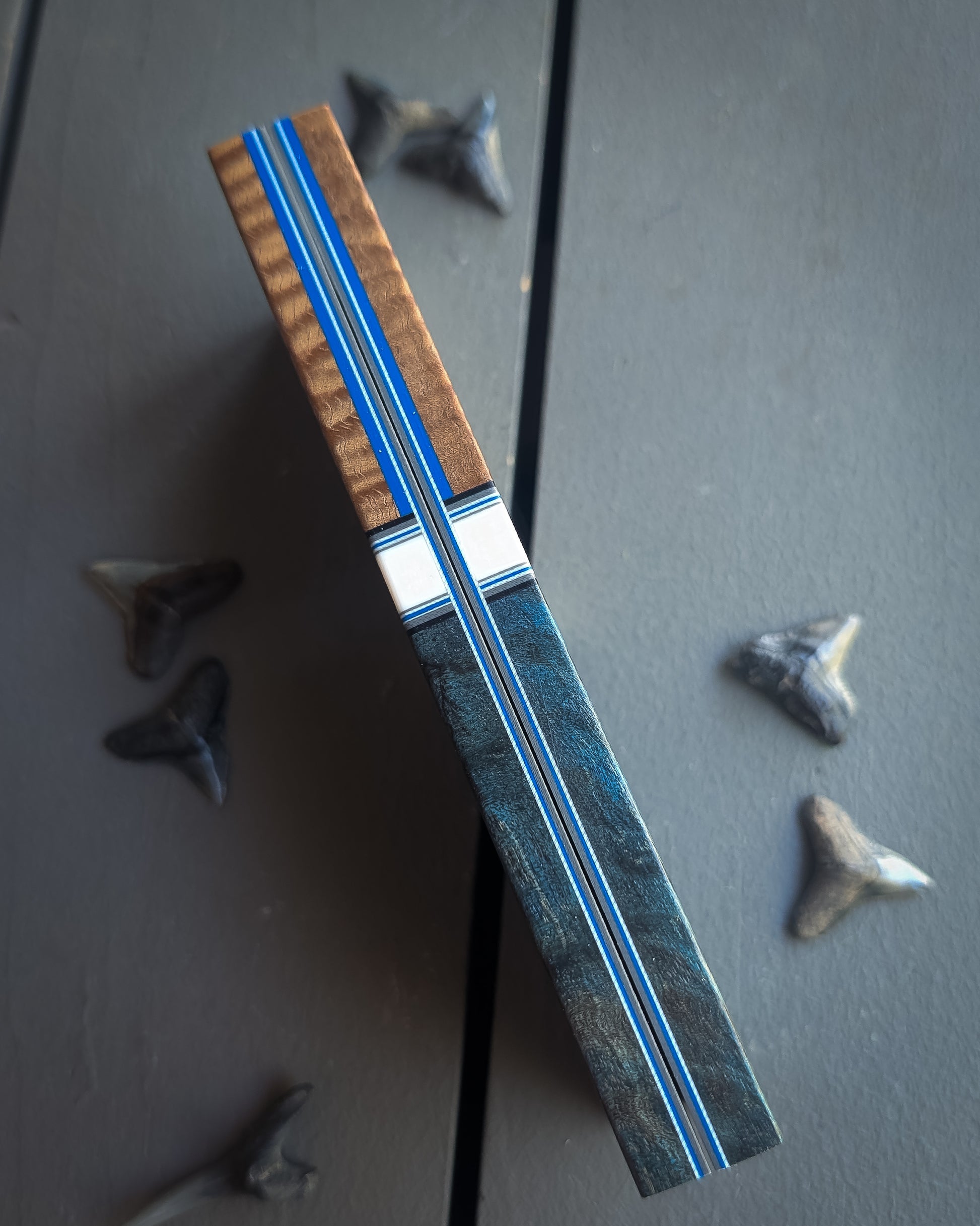 Material: Blue dyed redwood. Two tons koa. Ivory resin spacer with grey and blue accents. Ivory, blue, and grey liners.