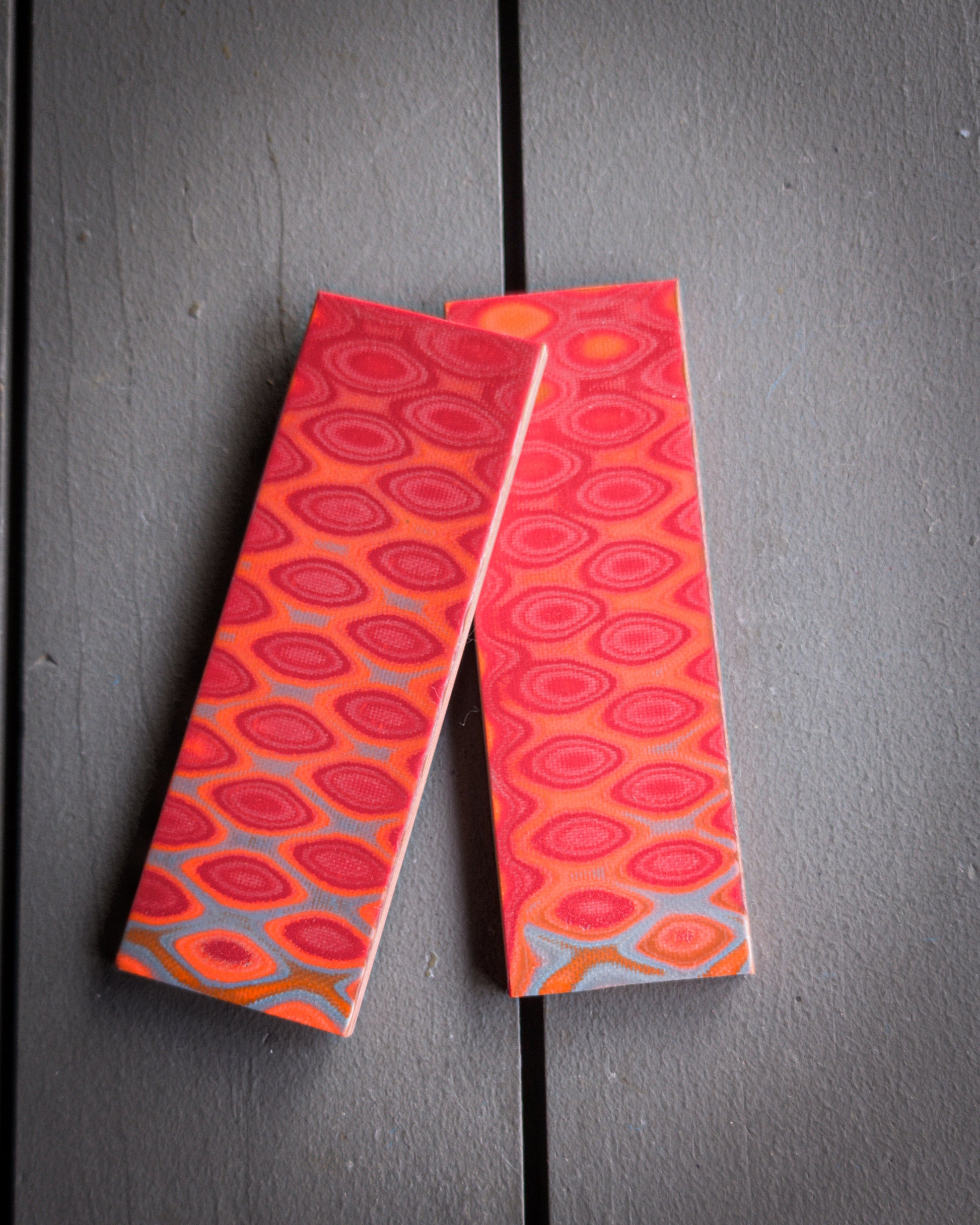 Material: Red, orange, and grey "python" G10 from Current Composites.