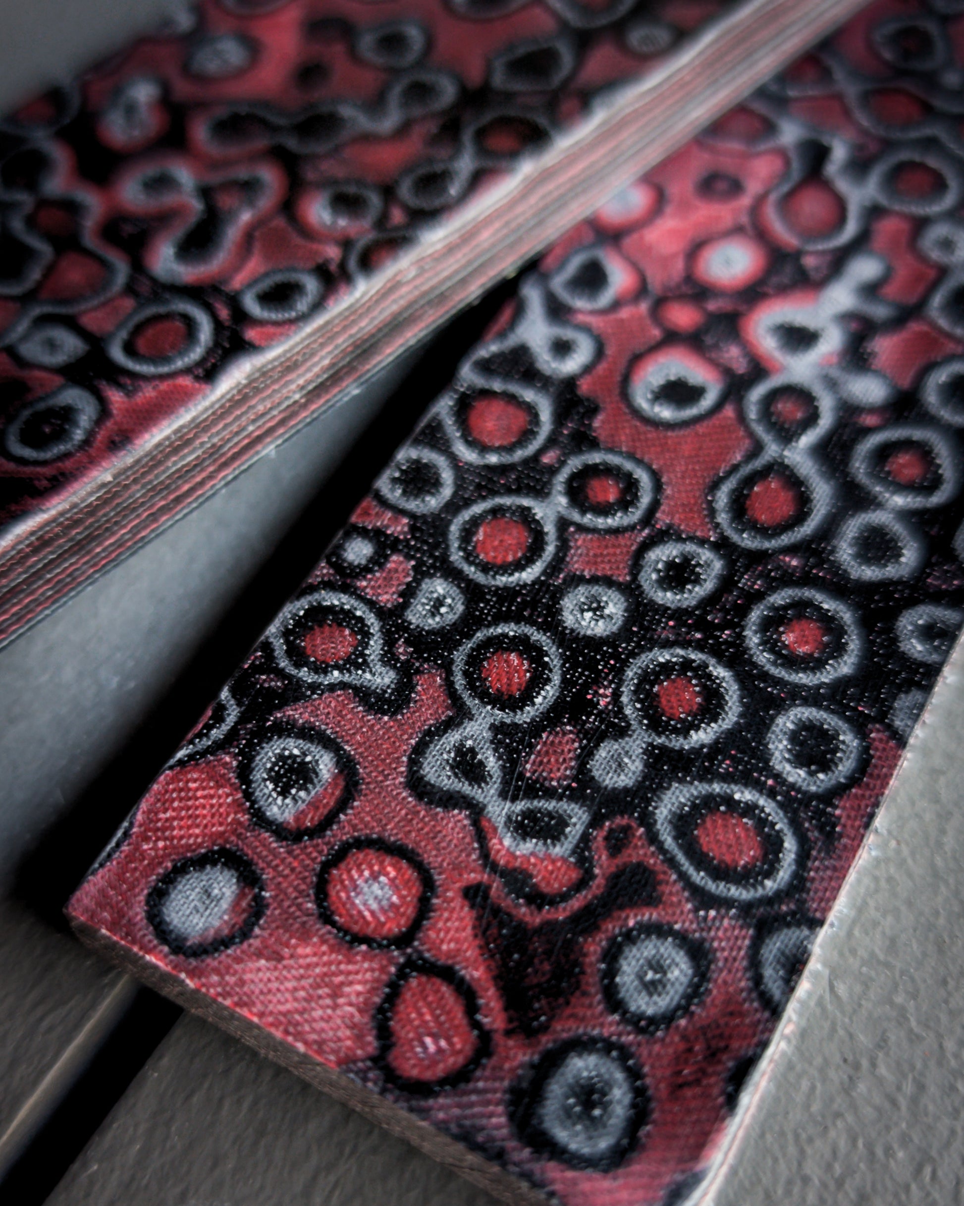 Material: Black, red, and grey patterned and layered micarta.