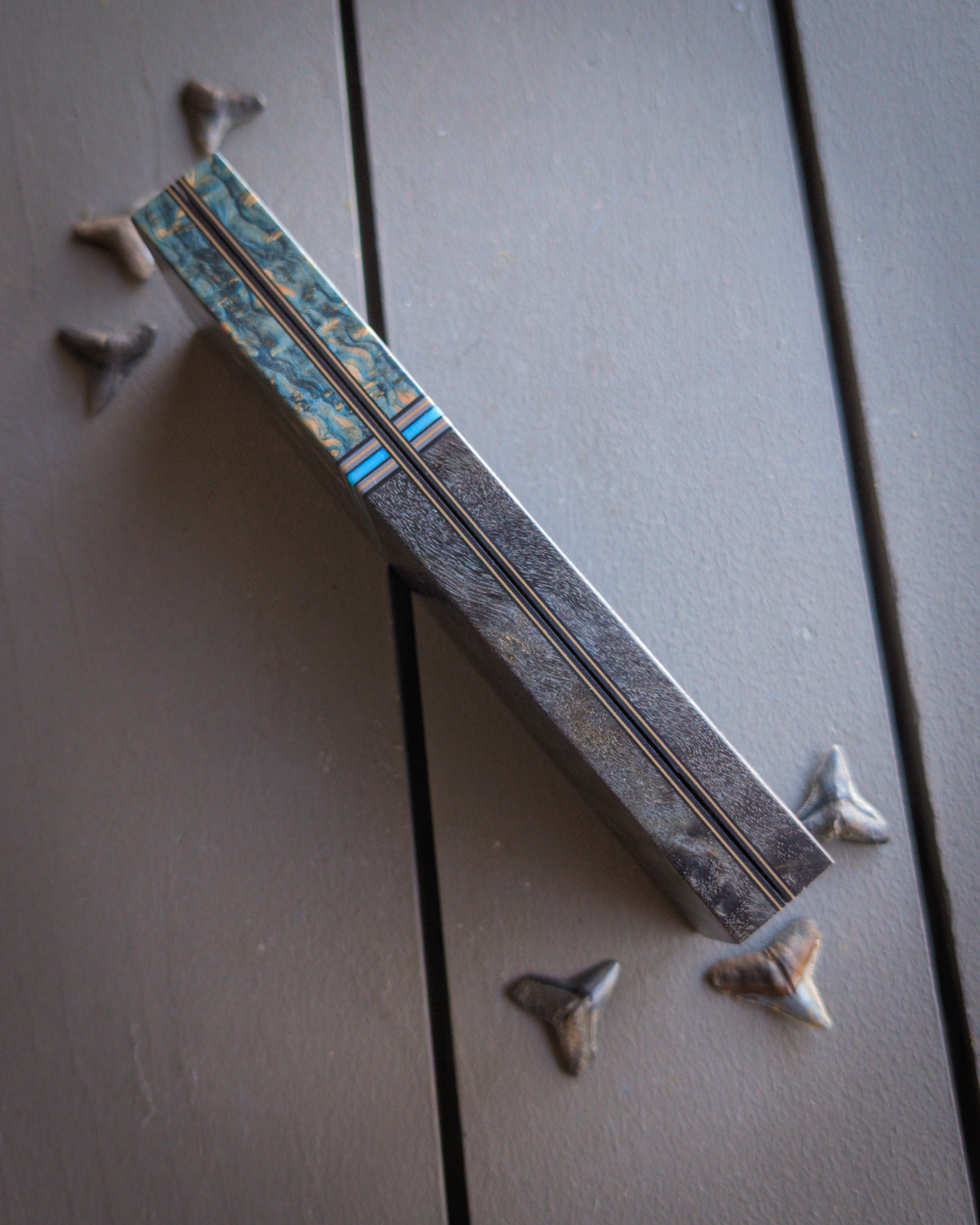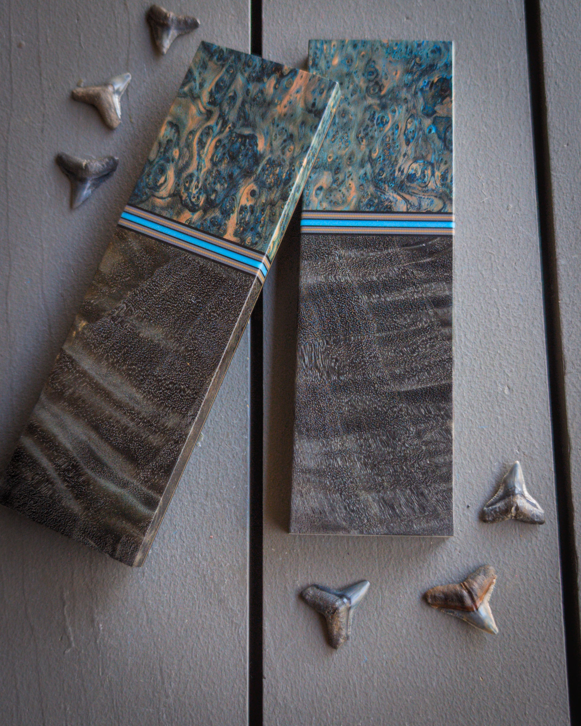 Material: Black cottonwood. Blue satinwood burl. Teal glow resin spacer with grey, black, and coyote accents. Coyote and black liners.