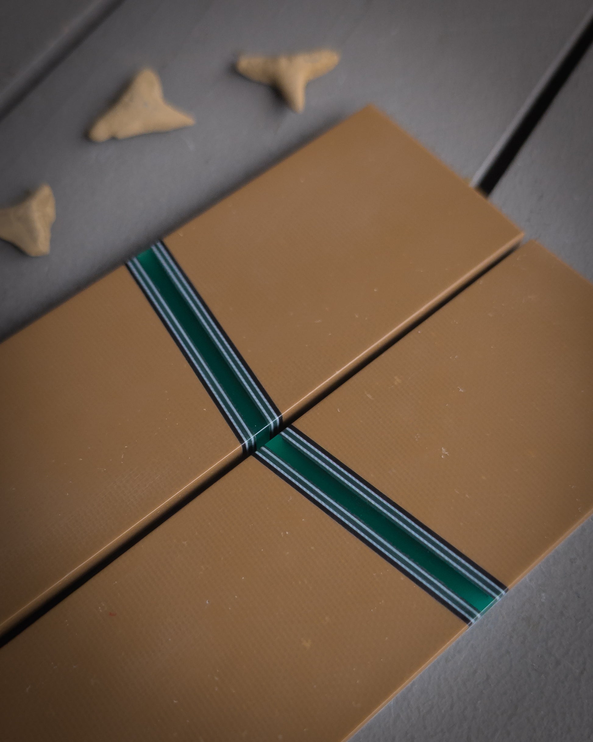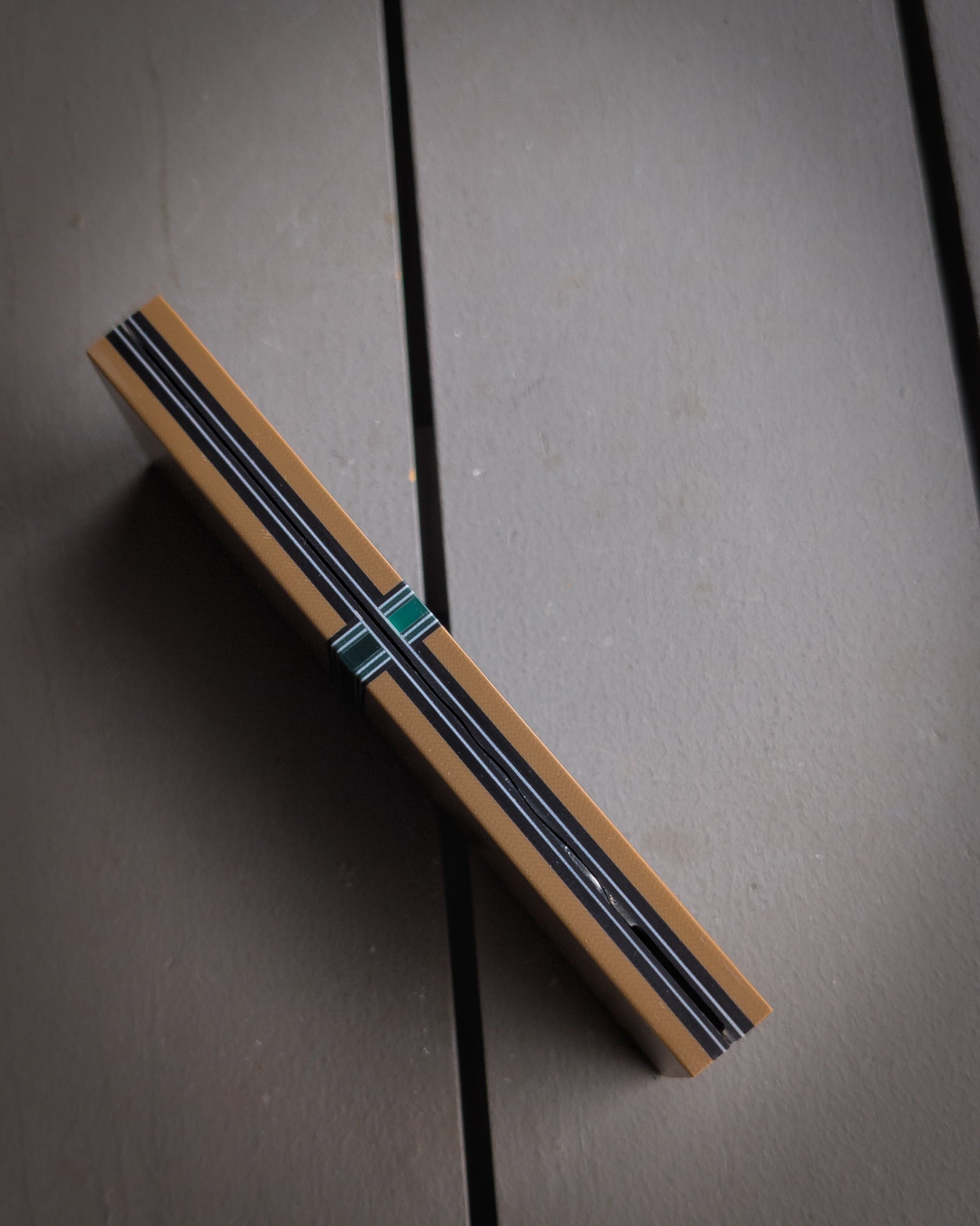 Material: Coyote G10. Green acrylic spacer with grey, black, and green accents. Black and grey liners.