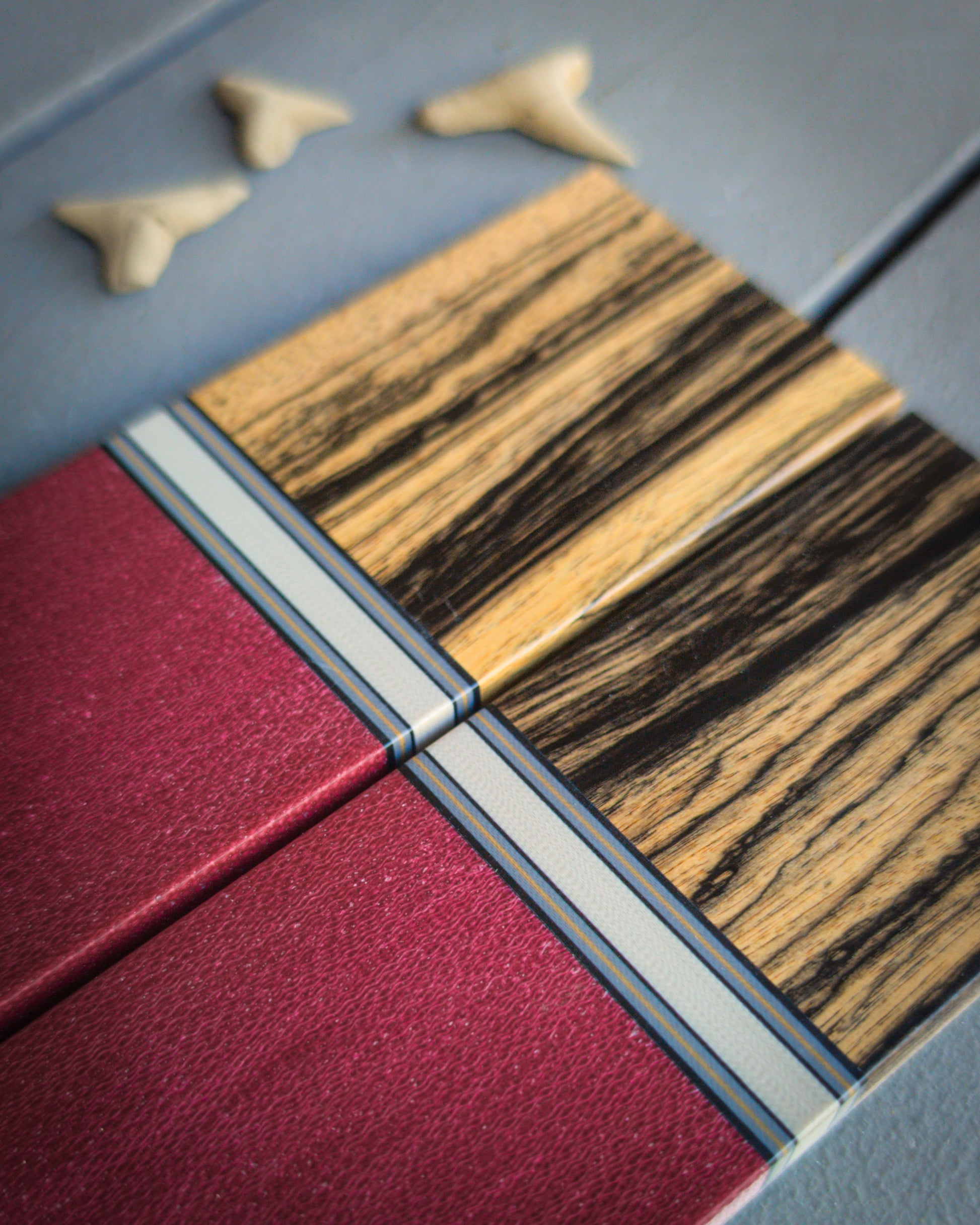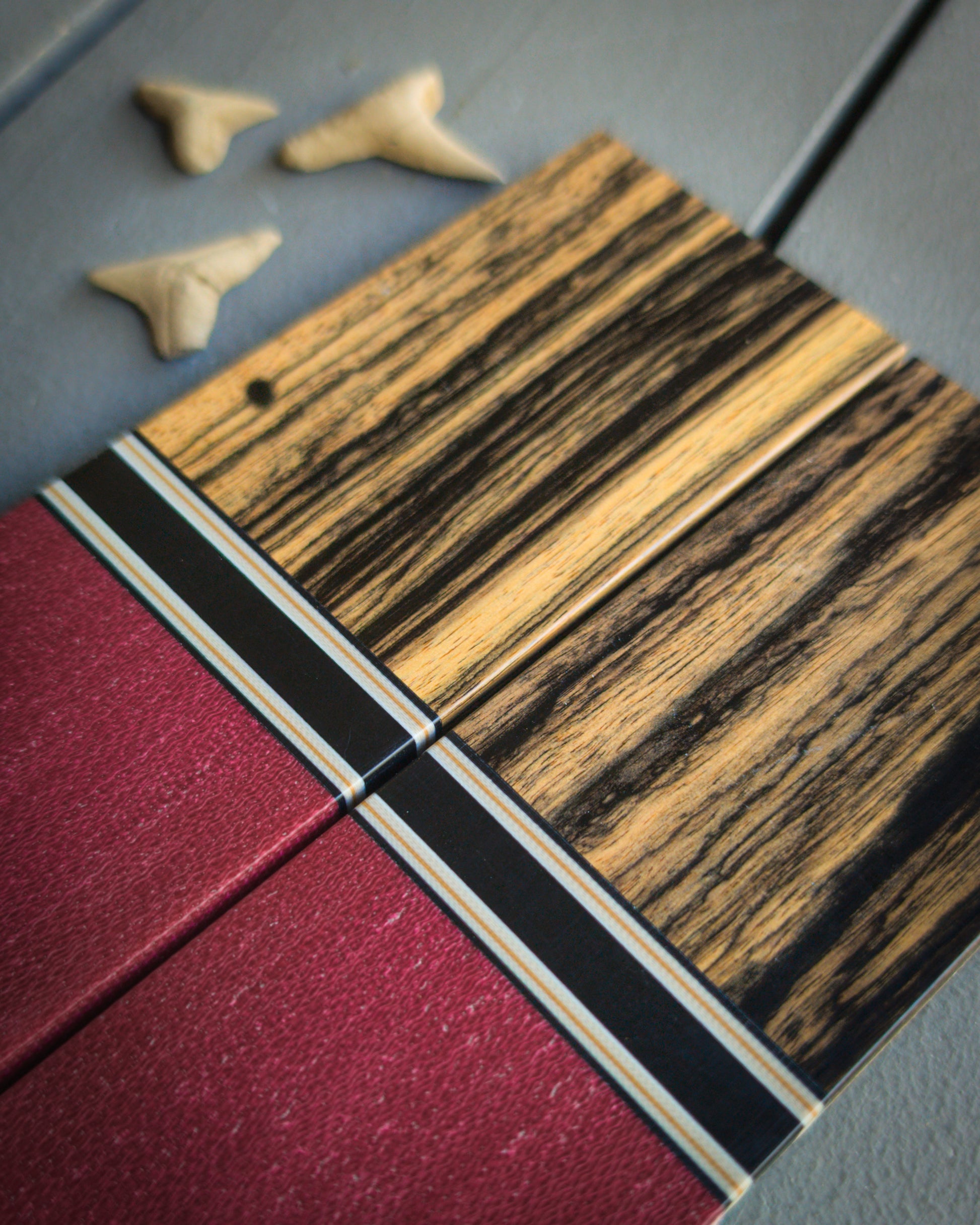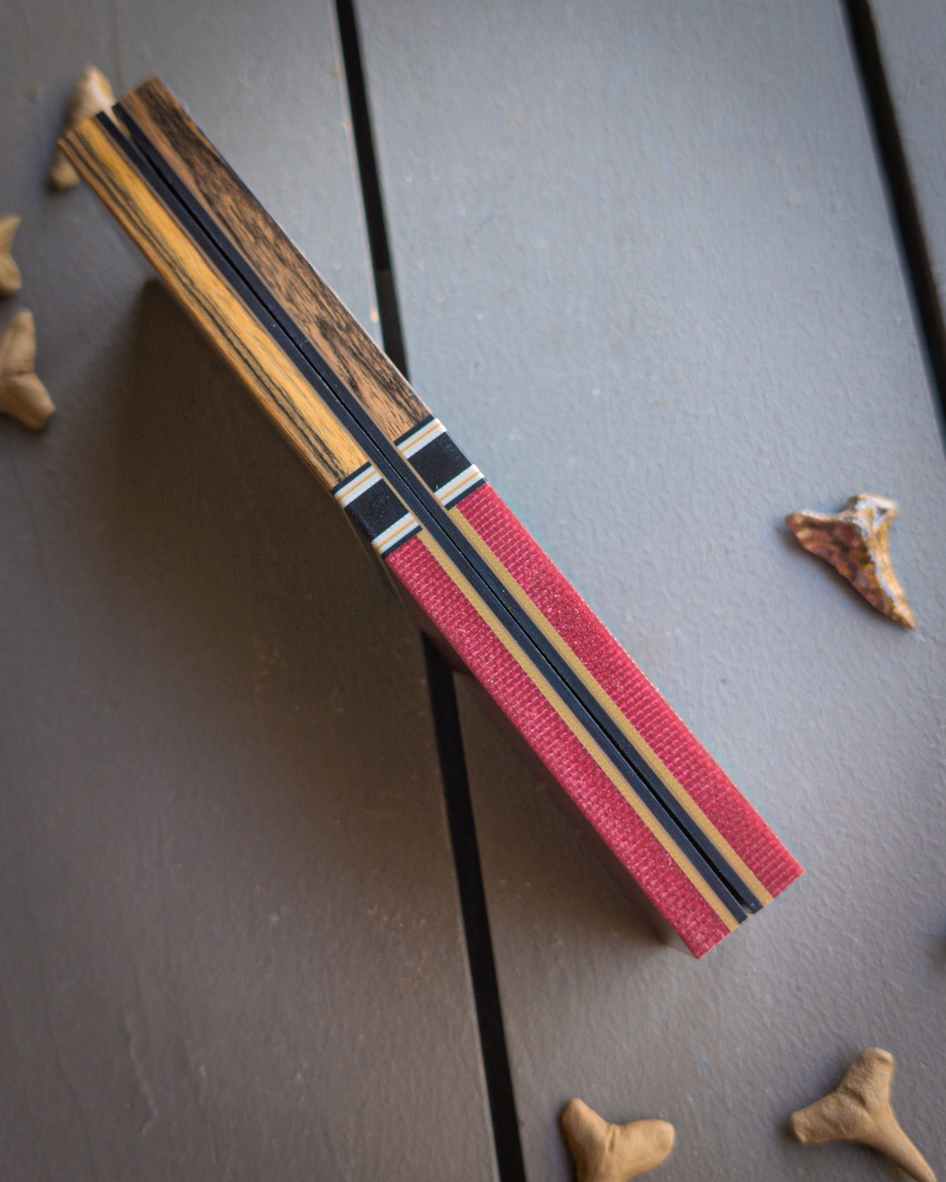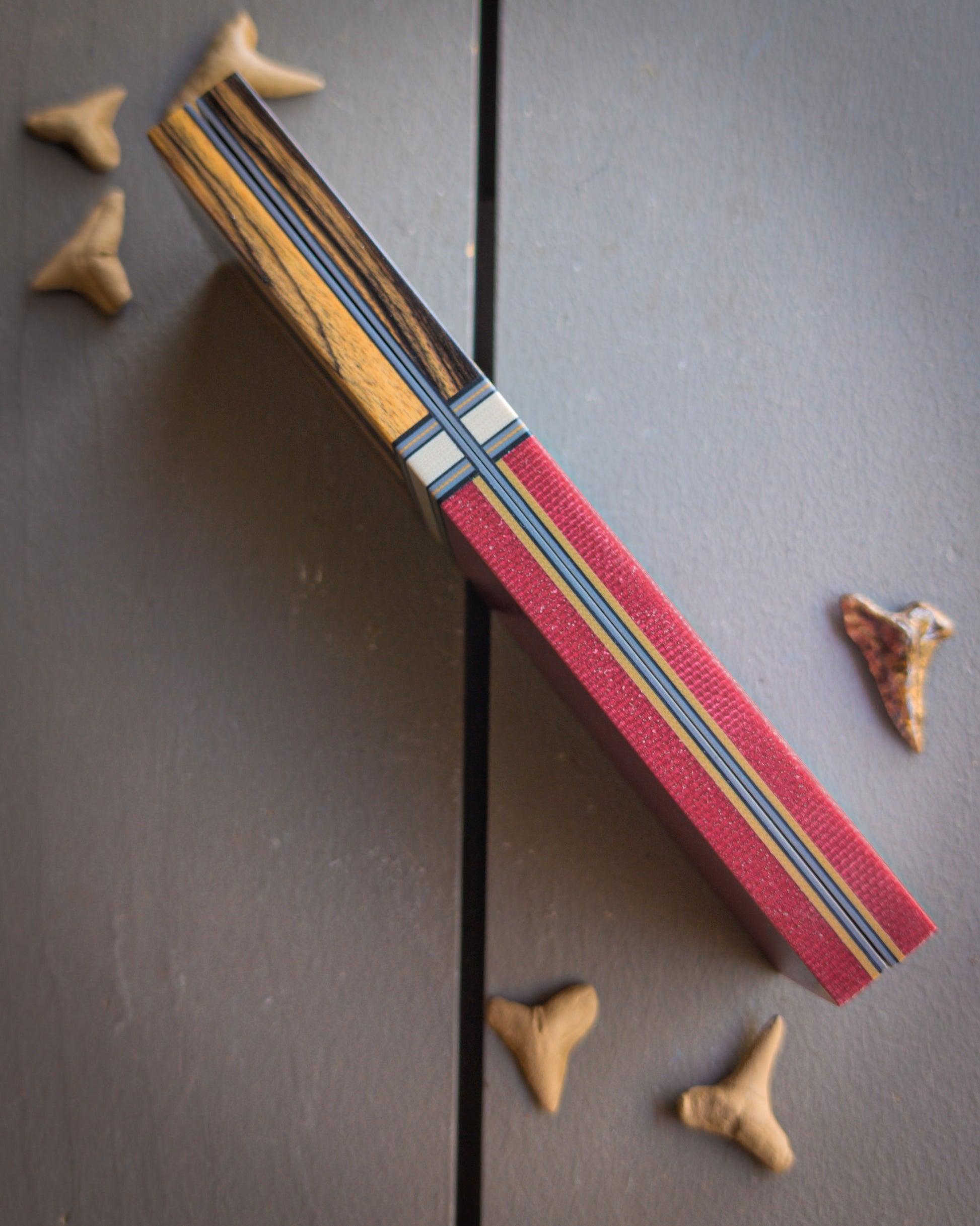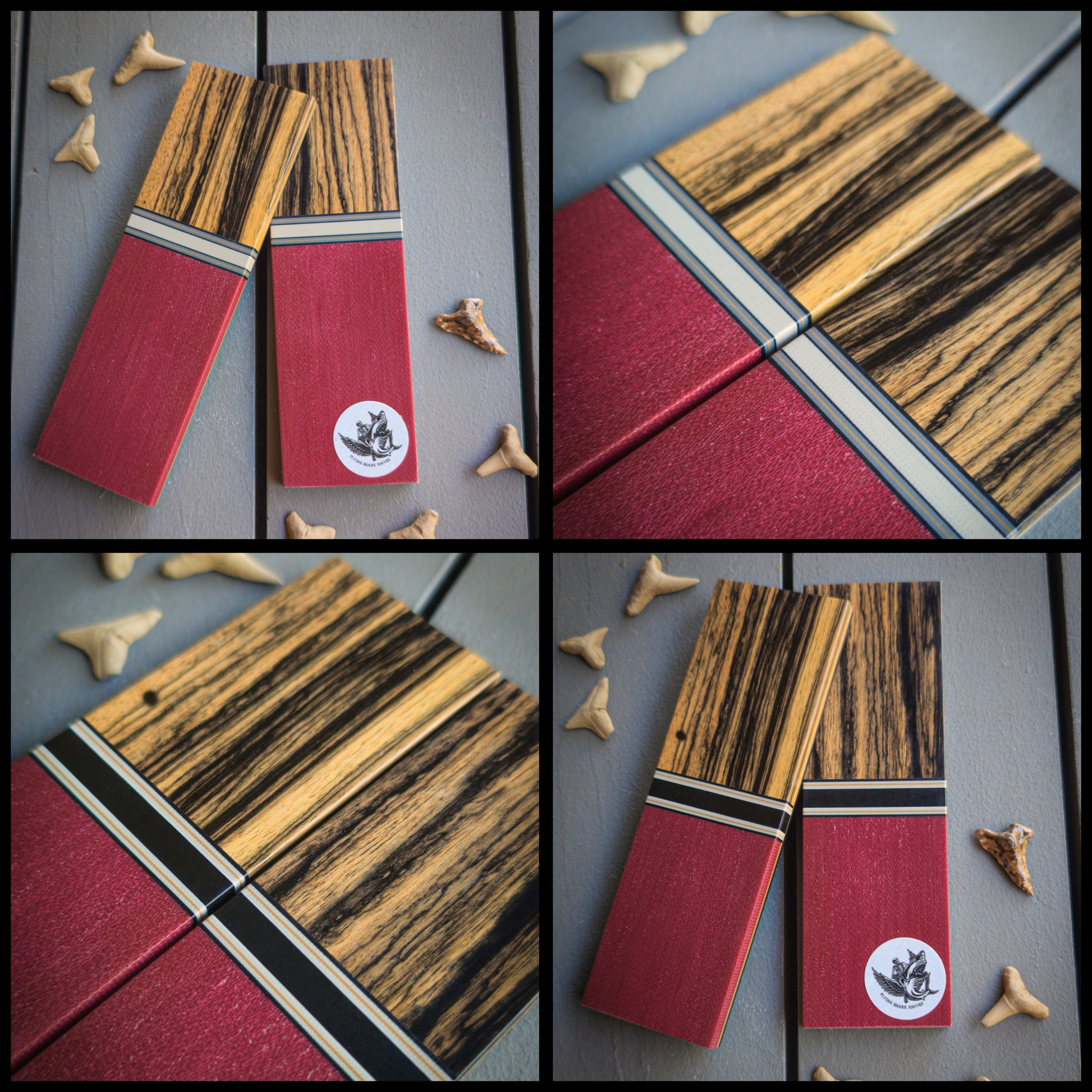 Set two: Bocote. Maroon canvas micarta. Tan G10 spacer with black, grey, and coyote accents. Coyote, black, and grey liners.
