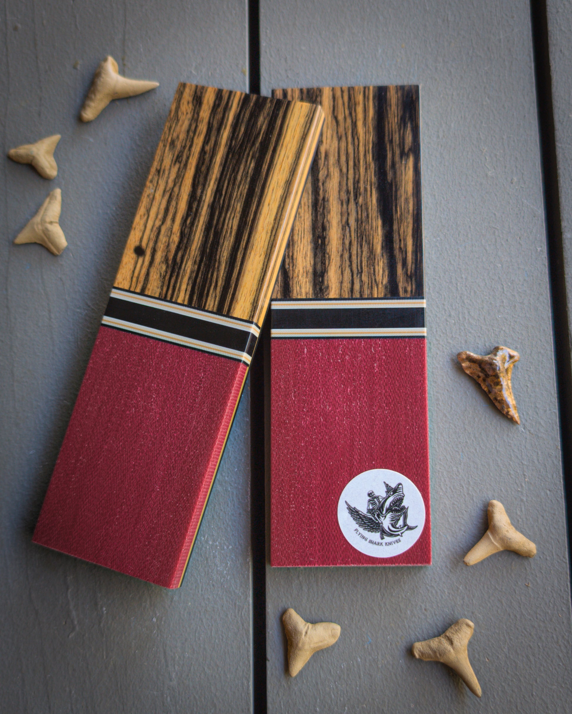 Set one: Bocote. Maroon canvas micarta. Black paper micarta spacer with tan and coyote accents. Coyote and black liners.