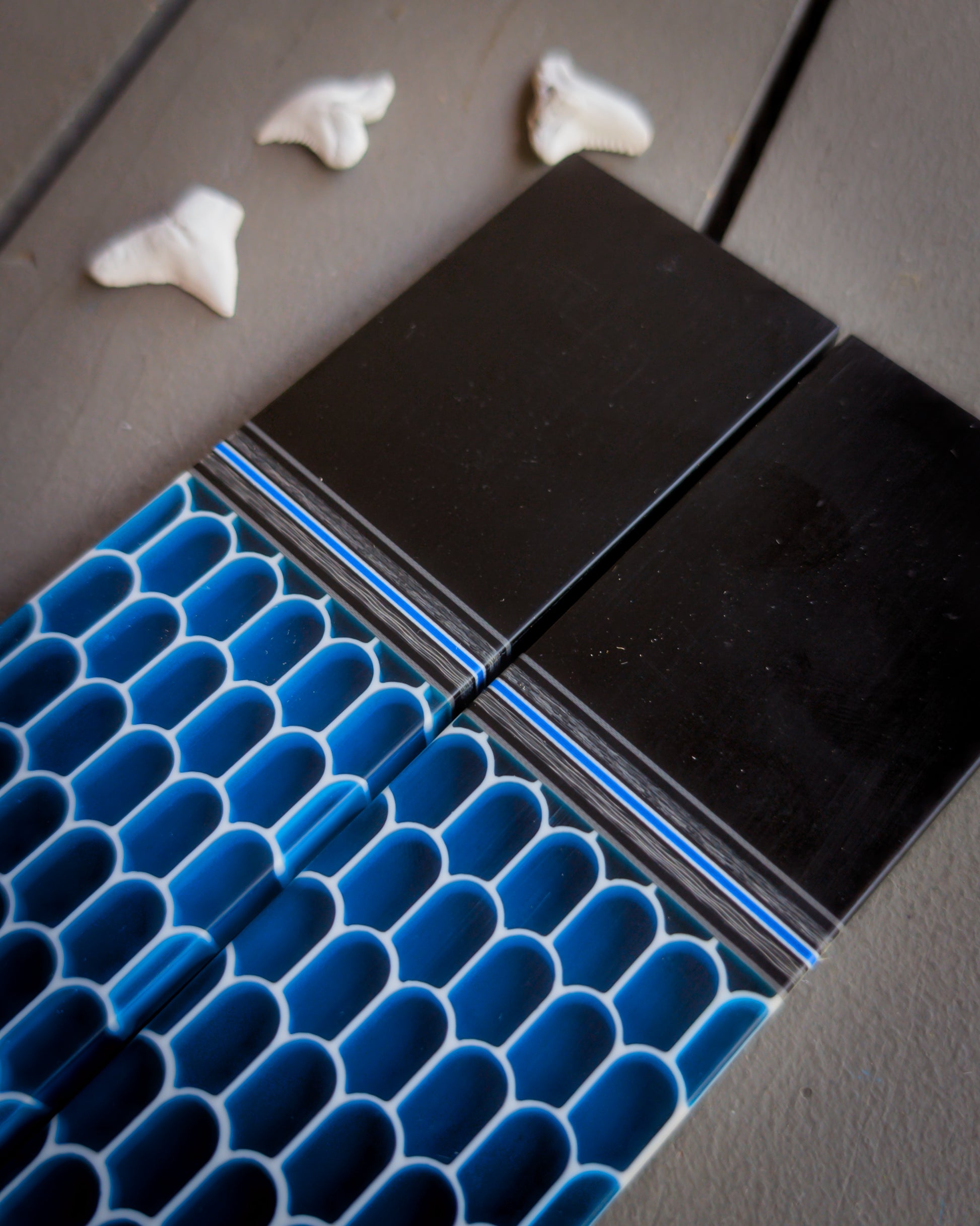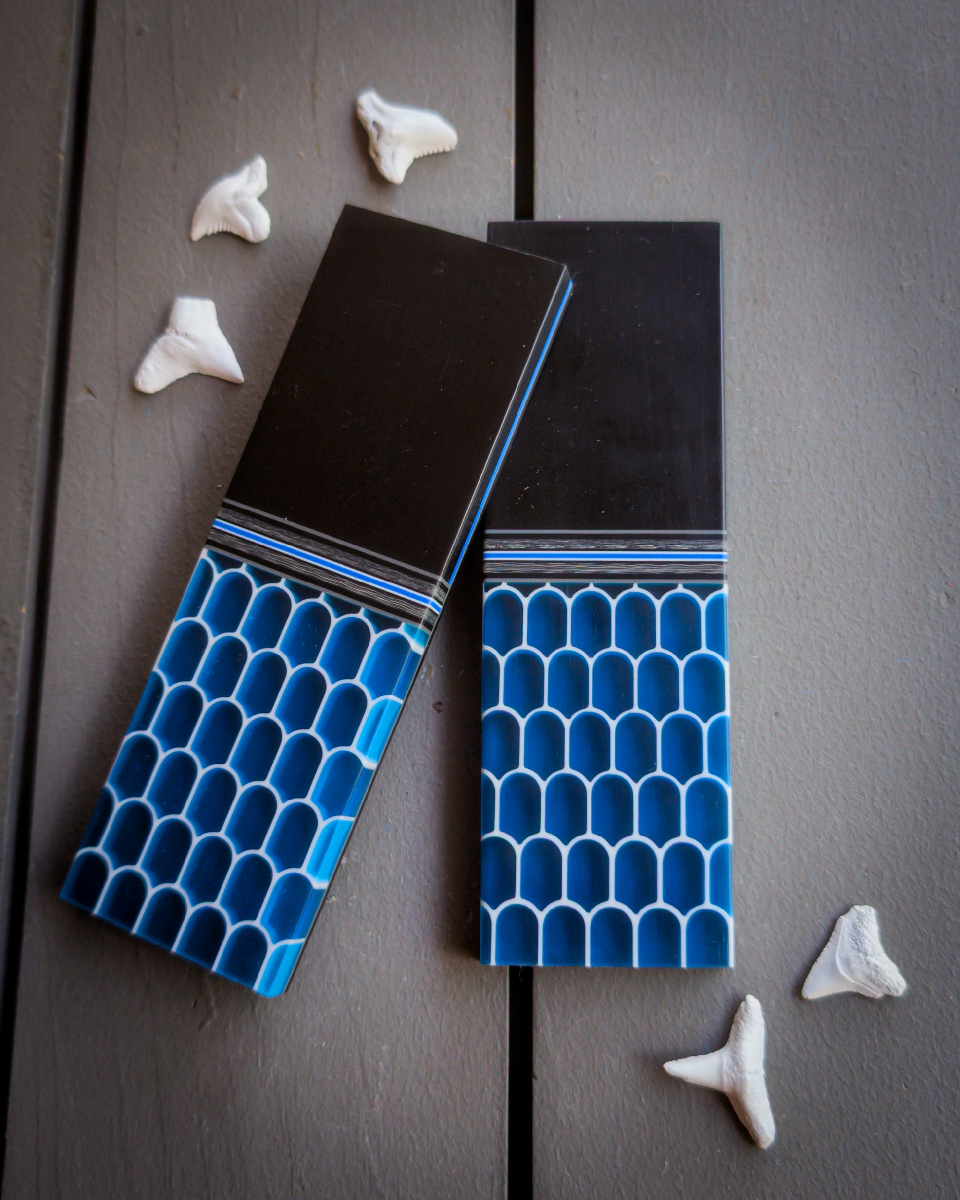 Material: Blue transparent fish resin. Black paper micarta. Silver CF spacer with grey, black, and blue accents. Blue, grey, and black liners.