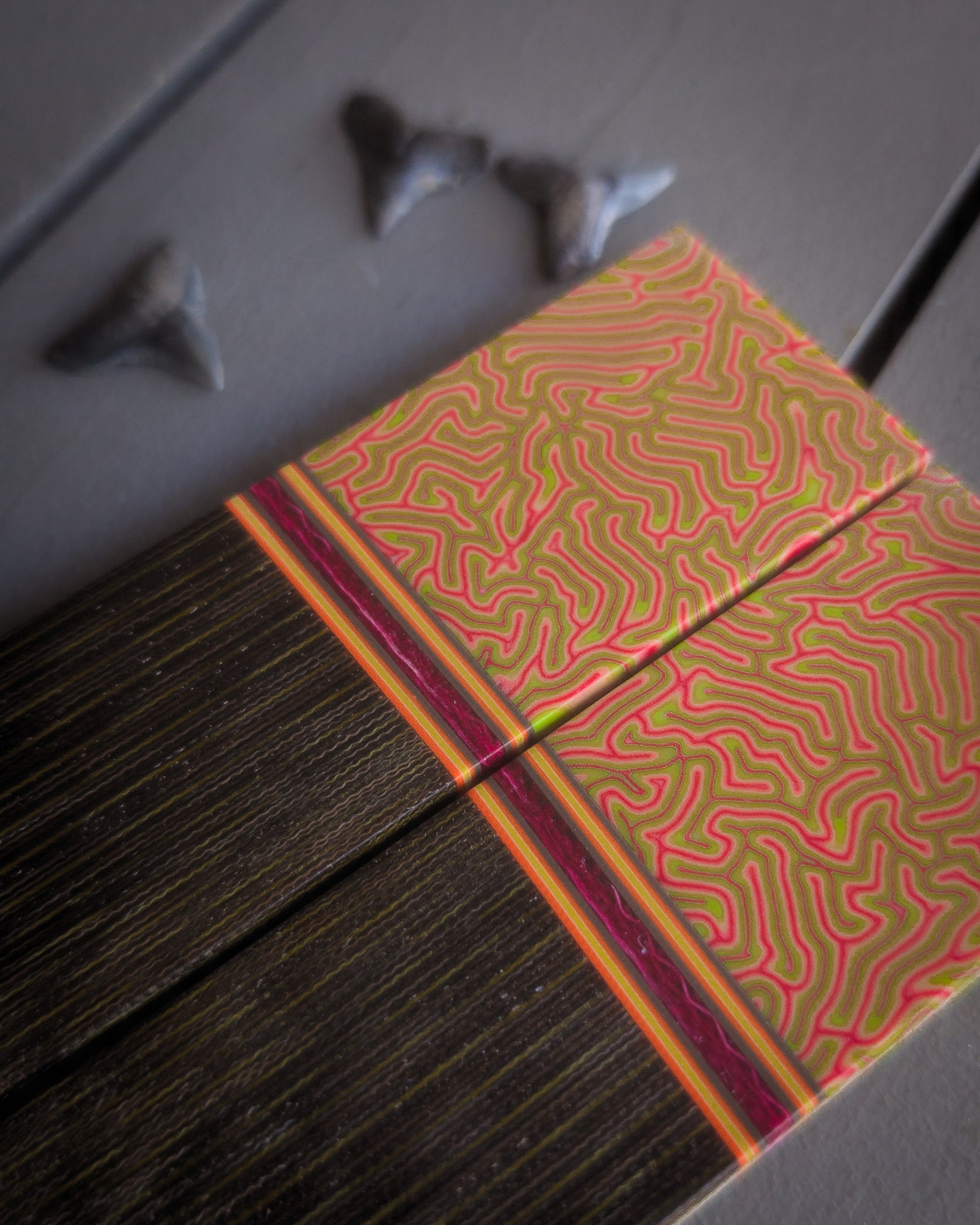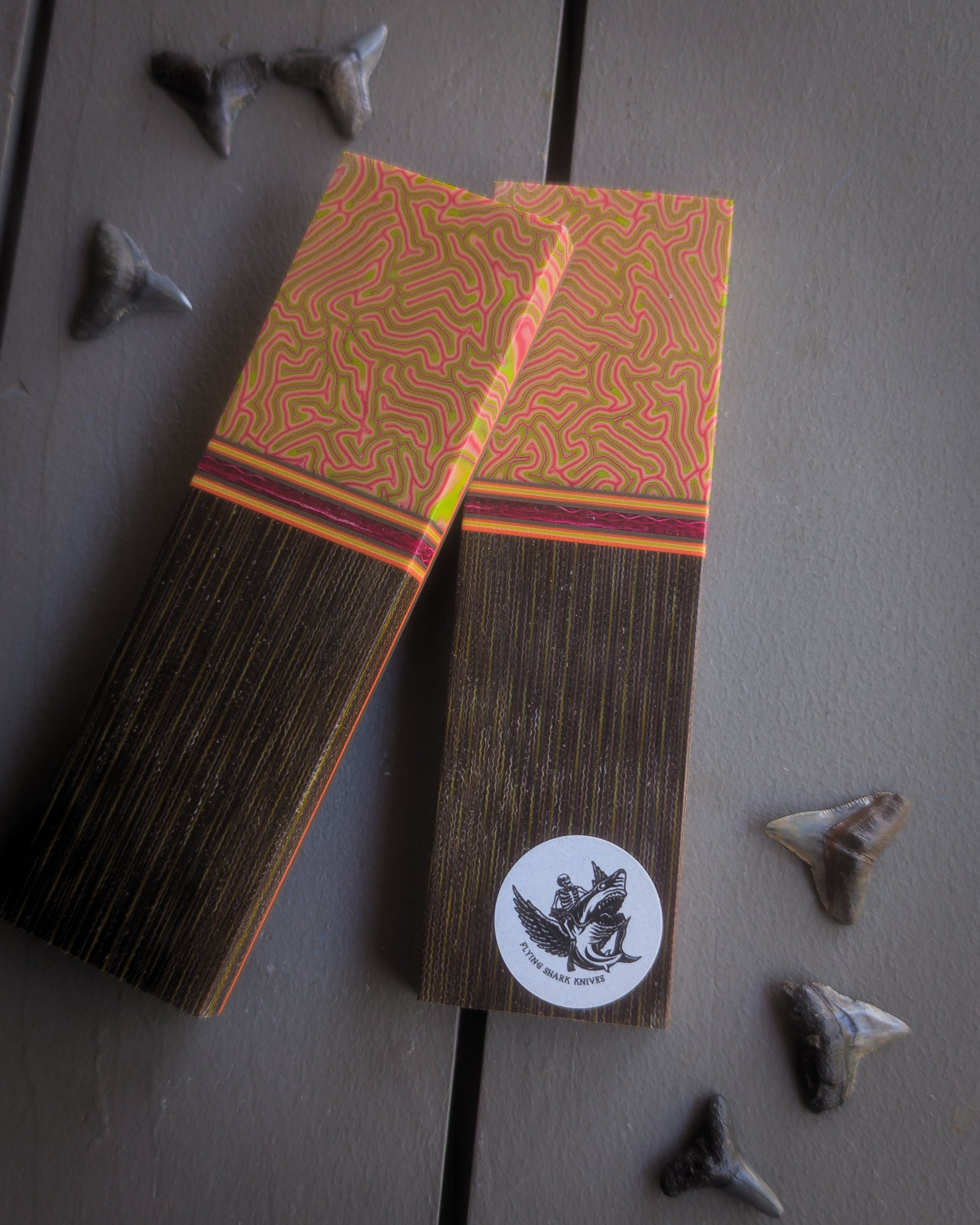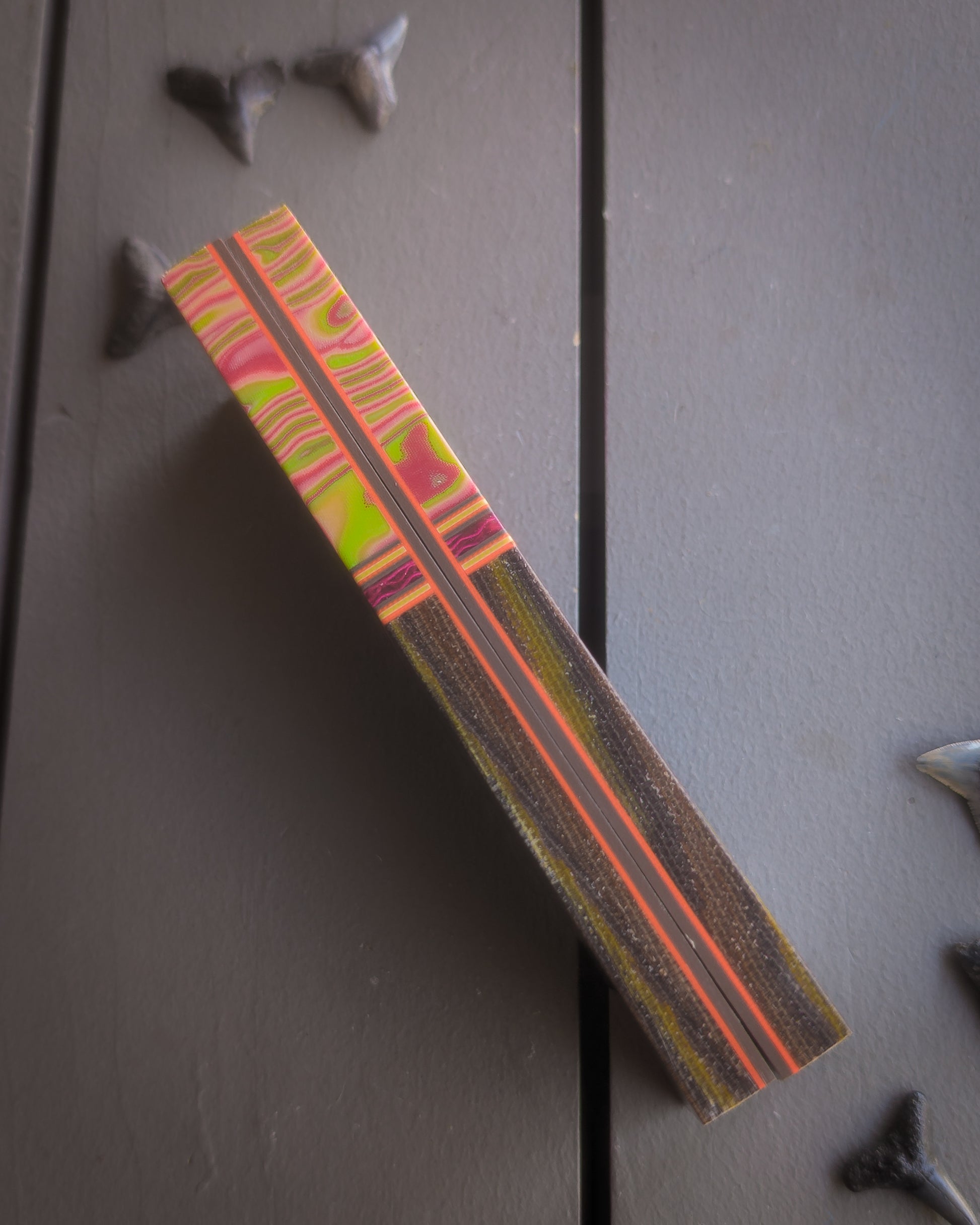 Material: Brown striped GCarta. Orange maze micarta. Fuscia burlap micarta spacer with yellow, orange, and grey accents. Orange and brown liners.