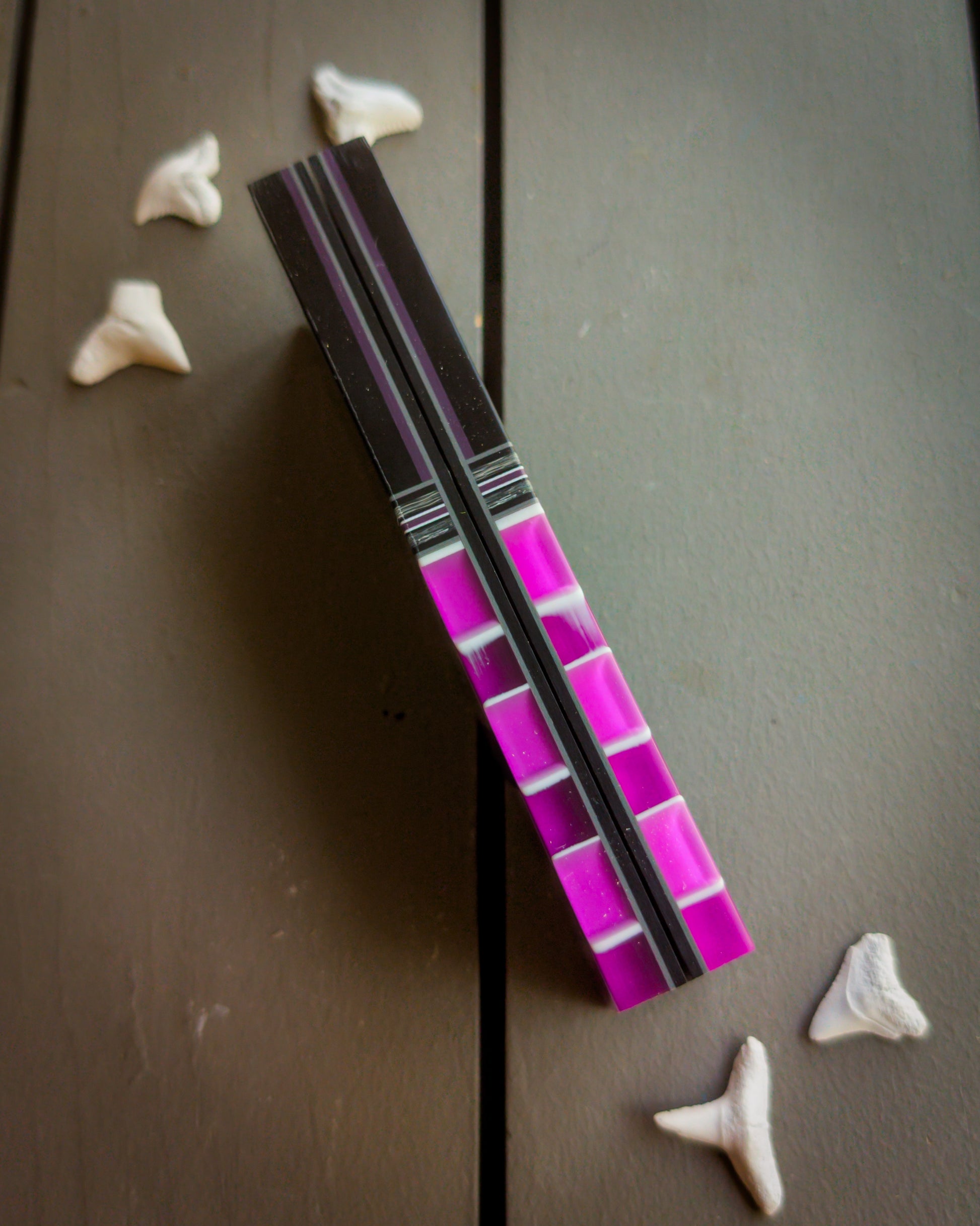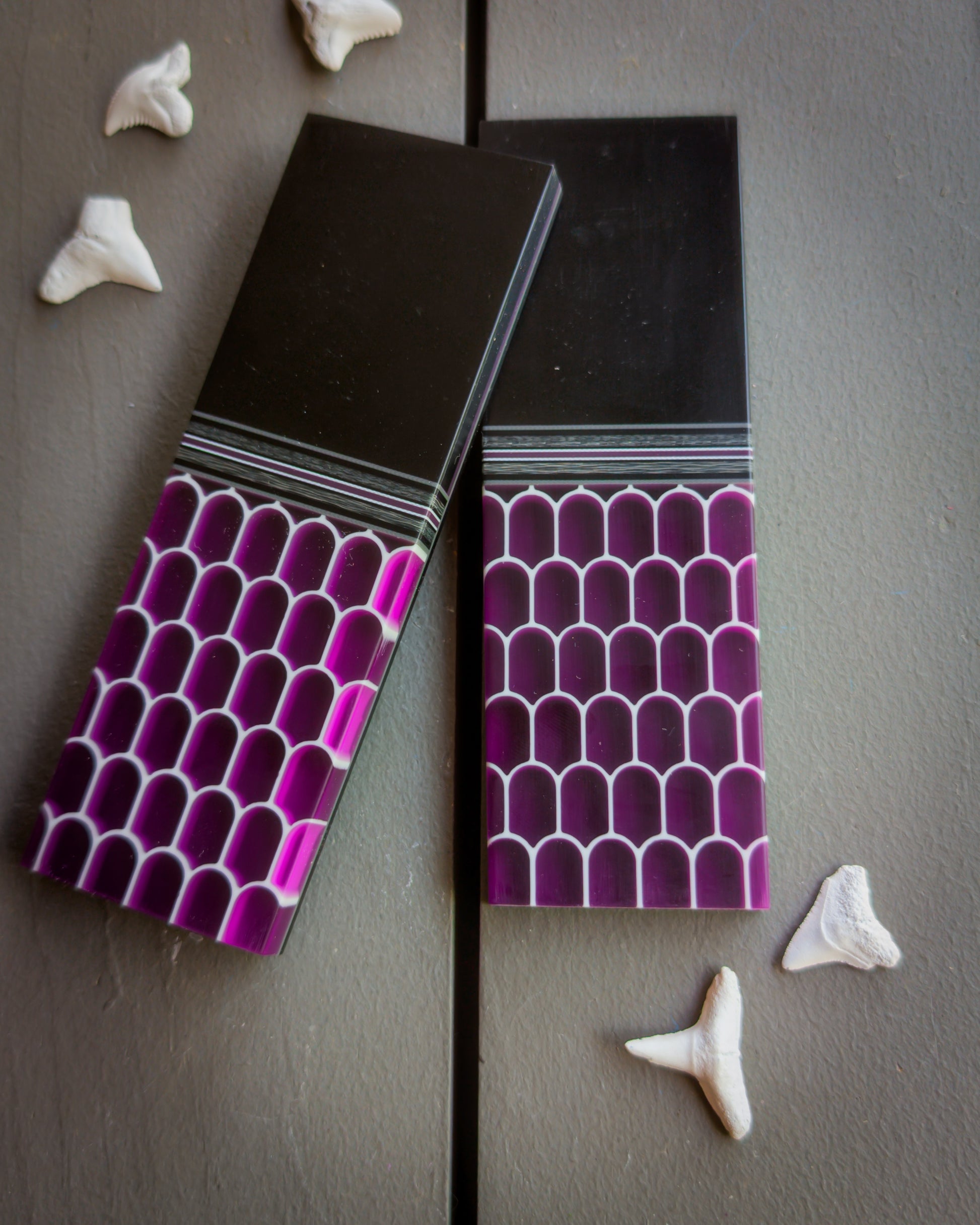 Material: Purple transparent fish resin. Black paper micarta. Silver CF spacer with grey, black, and purple accents. Purple, grey, and black liners.